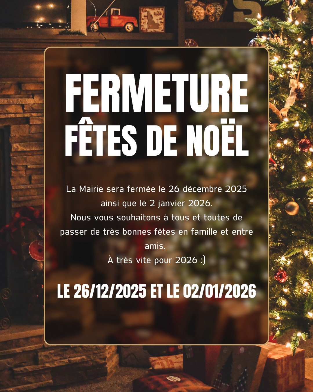 Nous vous informons que le secrétariat de la Mairie sera fermé le vendredi 26 décembre ainsi que le vendredi 02 janvier 2026.